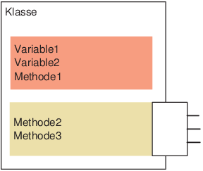 Dieses Kapitel stellt keine allgemeine Einführung in die objektorientierte Programmierung dar. Dazu gibt es spezielle Literatur, die häufig sogar unabhängig von einer konkreten Programmiersprache ist. Wie eine Anwendung optimal in Klassen, Methoden, Namespaces etc. aufgeteilt wird, ist einerseits mit viel Erfahrung verbunden und andererseits von dem zukünftigen Aufgabenbereich der Anwendung abhängig.Abbildung 5.1: Aufbau einer Klasse mit privatem und öffentlichem Teil