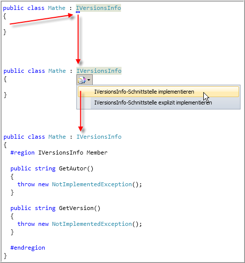 Das Visual Studio unterstützt Sie bei der Implementierung von Schnittstellen über Smarttags. Setzen Sie dazu den Cursor hinter den Schnittstellennamen. Es wird ein kleines Symbol unter dem ersten Buchstaben der Schnittstelle angezeigt. Wenn Sie mit der Maus darüber fahren und dann auf den Pfeil klicken, wird ein Menü geöffnet in dem Sie sich entscheiden können, wie Sie die Schnittstelle implementieren wollen. Die zweite "explizite" Implementierung wird im Anschluss besprochen. Damit Sie bei dieser automatisierten Implementierung nicht vergessen, die Methoden mit "vernünftigen" Anweisungen zu versehen, werden darin Exceptions ausgelöst.Mathe implementiert die Schnittstelle IVersionsInfo und muss deshalb die beiden Methoden GetAutor() und GetVersion() deklarieren.