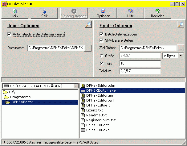 DF FileSplit besteht aus einer Dateiauswahl im unteren, den Optionsgruppen für Join- und