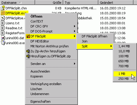 - Ab sofort steht ein Kontextmenüpunkt DF FileSplit bei der Auswahl von Dateien im Explorer zur Verfügung.
